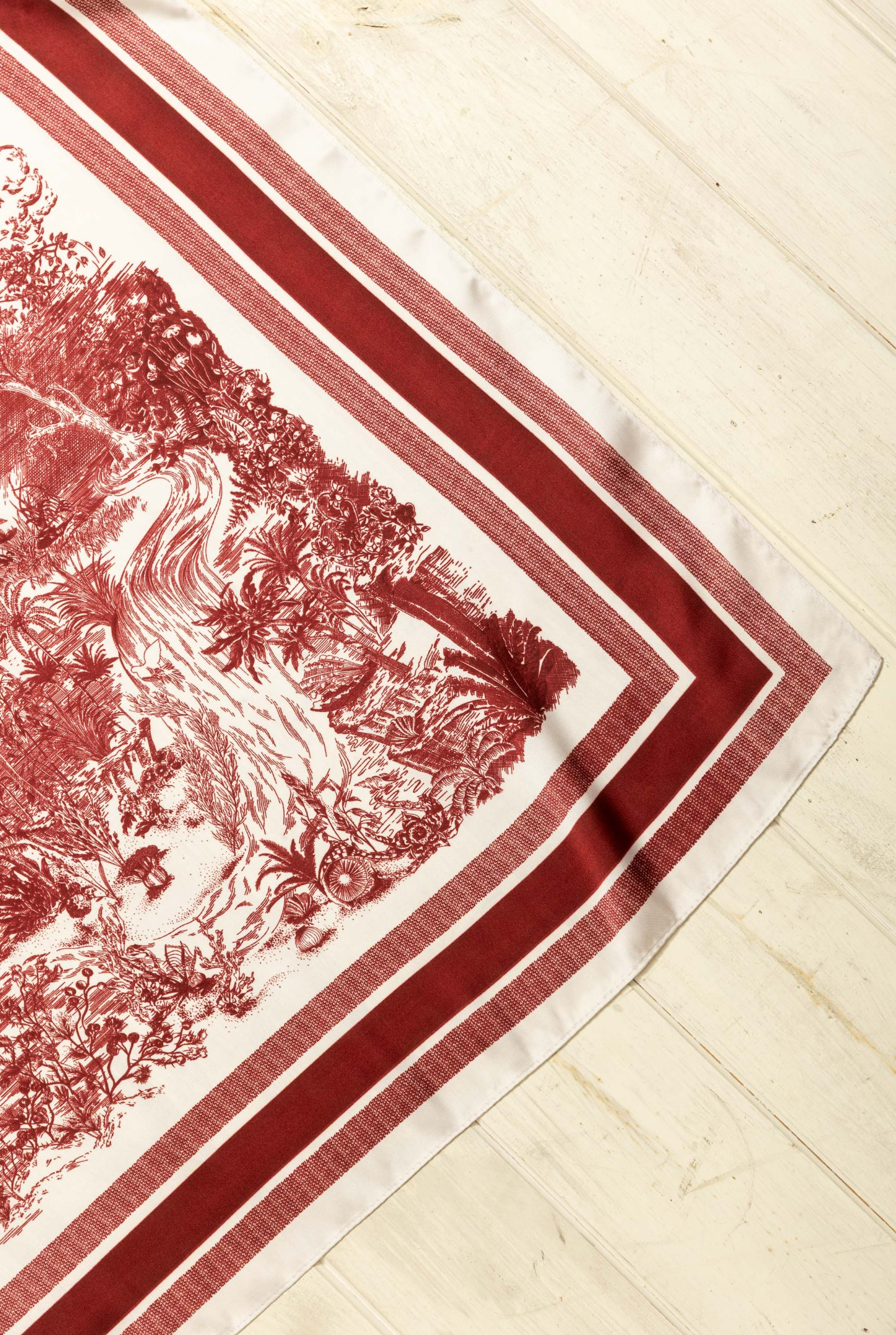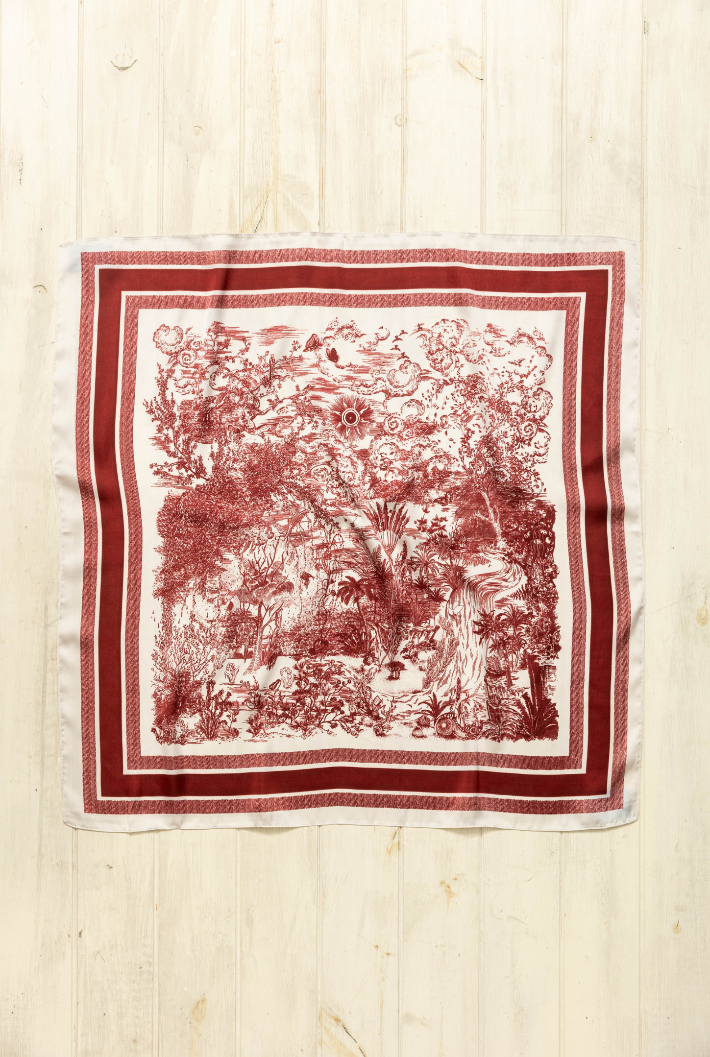 - Pañuelo cuadrado símil seda estampado. Diseño de paisaje estilo francés con guarda en tono bordo con fondo offwhite.