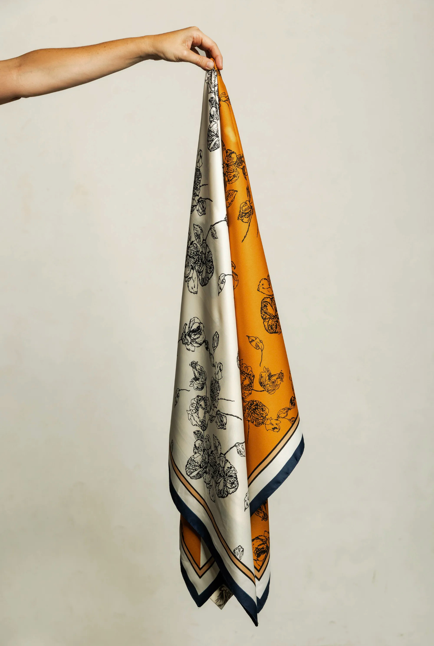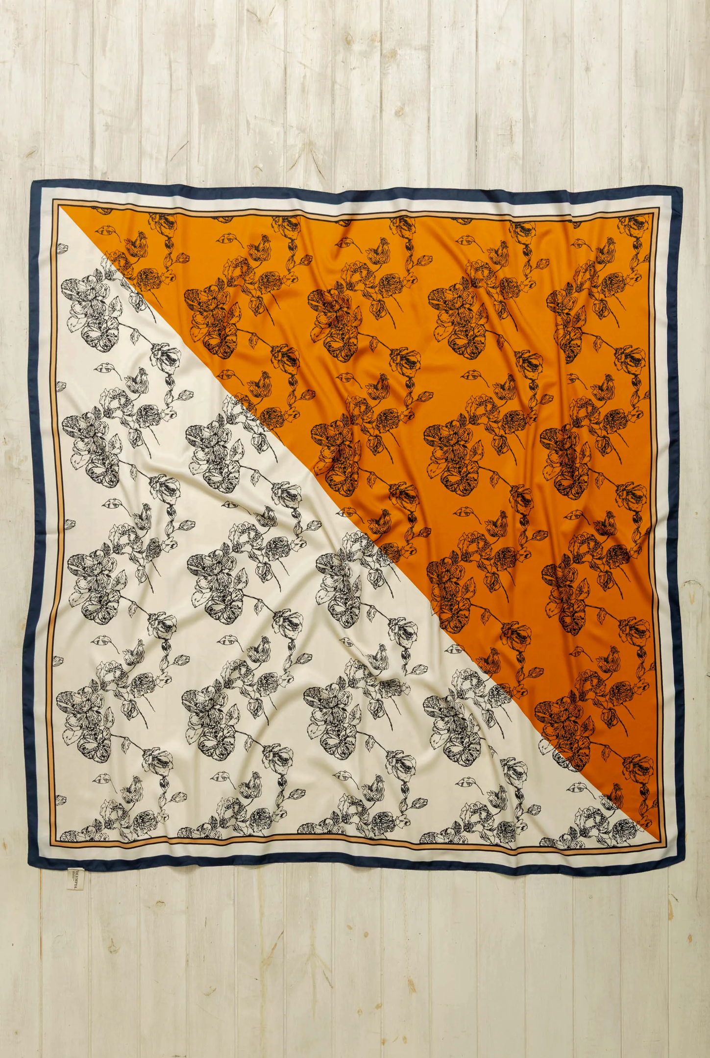 - Gran Pañuelo cuadrado símil seda estampado en tonos azul con base cruda y ocre. Diseño de estampa floral delicada